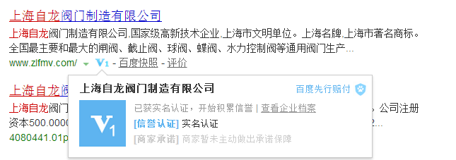 上海自龍閥門制造有限公司是百度公司認證用戶,企業(yè)資質(zhì)通過認證與核實后由百度進行V認證,百度信譽V認證也稱百度信譽檔案。是通過對互聯(lián)網(wǎng)商家網(wǎng)站及網(wǎng)站背后的經(jīng)營實體的資質(zhì)、真實性認證、可信行為、消費承諾意愿、口碑評價等數(shù)據(jù)的集合,以信譽評級和信譽成長值等方式,把網(wǎng)站的綜合信譽情況呈現(xiàn)給網(wǎng)民,作為網(wǎng)民決策的參考依據(jù)。在認證后確保了企業(yè)的真實性,企業(yè)的責任義務性。確保了客戶在采購時的害怕與擔心。