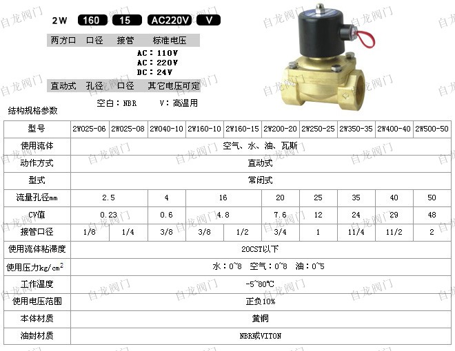 噴灌,無塔供水的常用2W型電磁閥 農(nóng)業(yè)自動化2W型電磁閥 電磁閥作為一種使用功率極低的閥門已經(jīng)普遍應(yīng)用于各個行業(yè),如噴灌和無塔供水的使用,上海自龍閥門生產(chǎn)的2W型電磁閥,有直流24V,交流110V、220V、380V。而只需要25W型電磁閥的功率就可以帶動開啟,功率較比節(jié)能電燈。由于使用門檻低,在農(nóng)業(yè)生產(chǎn)噴淋澆灌得到很好的應(yīng)用 上海自龍閥門生產(chǎn)的2W型電磁閥,是全銅閥門,線圈是由全銅線制作而成,閥體鍛銅鑄成,防銹衛(wèi)生上可以延長其使用壽命,中部密封由進口膜片組成,實驗壽命開啟閉合多達(dá)兩萬余次,是一款質(zhì)量非常好的暢銷產(chǎn)品。 2W型電磁閥怎么接線實現(xiàn)自動化控制?這是廣大用戶常常購買前要考慮的問題,上海自龍閥門廠專業(yè)生產(chǎn)電磁閥、氣動電動化自動閥門,有完善的一條龍服務(wù),廠里可以為客戶配置控制器,可以時間控制、溫度控制、壓力控制,而在一些環(huán)境惡劣的環(huán)境,2W型電磁閥可以配備:防爆線圈、防水線圈、絕緣線圈,以確保電磁閥的使用安全。 2W型電磁閥的開啟壓力?上海自龍閥門廠生產(chǎn)的2W型電磁閥,中部是由進口膜片組成,管道壓力僅需要0.05mpa,膜片閉合時可承壓0.8mpa,高壓密封性能極強,低壓就可助力開啟,密封和開啟都有很大的保障。 電磁閥尺寸規(guī)格