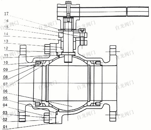 圖中數(shù)字含義:1表示閥體,2表示閥蓋,3表示雙頭螺柱,4表示螺母,5表示墊圈,6表示球體,7表示閥座,8表示閥座支承圈,9表示閥座彈簧,10表示閥座密封圈,11表示閥桿,12表示止推軸承,13表示閥桿填料,14表示填料壓環(huán),15表示填料壓蓋,16表示螺釘,17表示定位板。