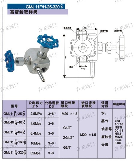上海自龍閥門制造有限公司生產(chǎn)的高密取樣閥GMJ14F的密封性良好,一般用于較小流量,較高壓力的氣體或液體(如蒸汽、油品)介質(zhì)的密封。該針型閥種類一般分為普通截止閥、針型截止閥、角式針型閥、儀表針型閥、波紋管針型閥、閥組等。針型截止閥的密封性良好,使用壽命長,即使密封面損壞后,也只需要更換易損零件,即可繼續(xù)使用。針形截止閥的密封性良好,使用壽命長,即使密封面損壞后,也只需要更換易損零件,即可繼續(xù)使用。安裝時(shí)應(yīng)使介質(zhì)的流向與閥體上的箭頭方向一致。針形閥門的閥芯就是一個(gè)很尖的圓錐體,好象針一樣插入閥座,由此得名。 針形閥門比其他類型的閥門能夠耐受更大的壓力,密封性能好,所以一般用于較小流量,較高壓力的氣體或者液體介質(zhì)的密封。 針形閥門與壓力表配合使用是最合適的了,一般的針形閥門都做成螺紋連接(當(dāng)然也有法蘭及其他形式的連接)。